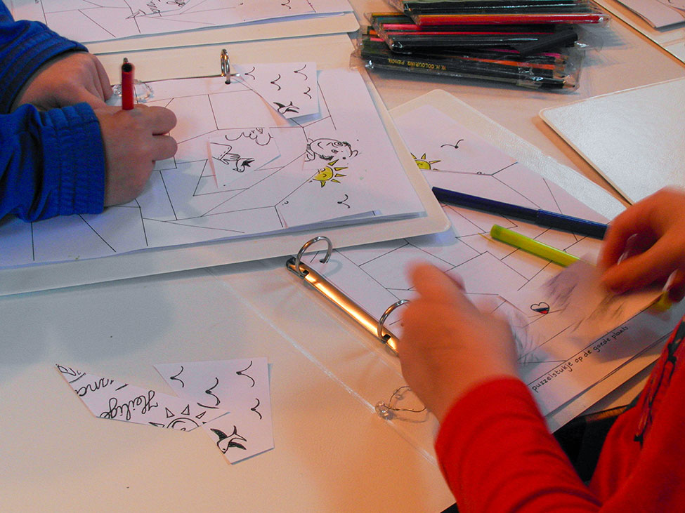 De middenbouwgroep ging wat meer in op wat er aan Kerstmis voorafging. Er was de boodschap van de engel aan Maria, en daarmee ook het Weesgegroet. De kinderen knutselden een mini-rozenkransje van kraaltjes. Er werden puzzelstukjes uitgedeeld: stukjes van een kleurplaat van Franciscus van Assisi. Franciscus, want zo heet onze parochie, maar de kinderen kregen één stukje per keer. De kleurplaat bleek een soort presentie-stempelkaart te zijn, eentje die de kinderen stukje voor stukje mogen inkleuren.