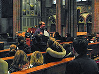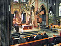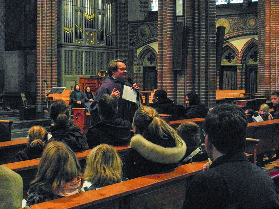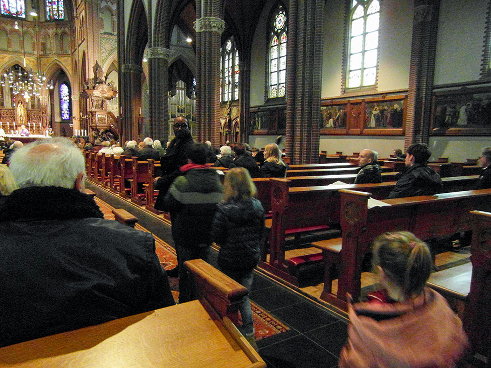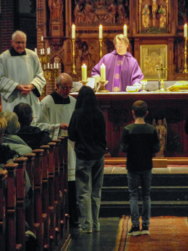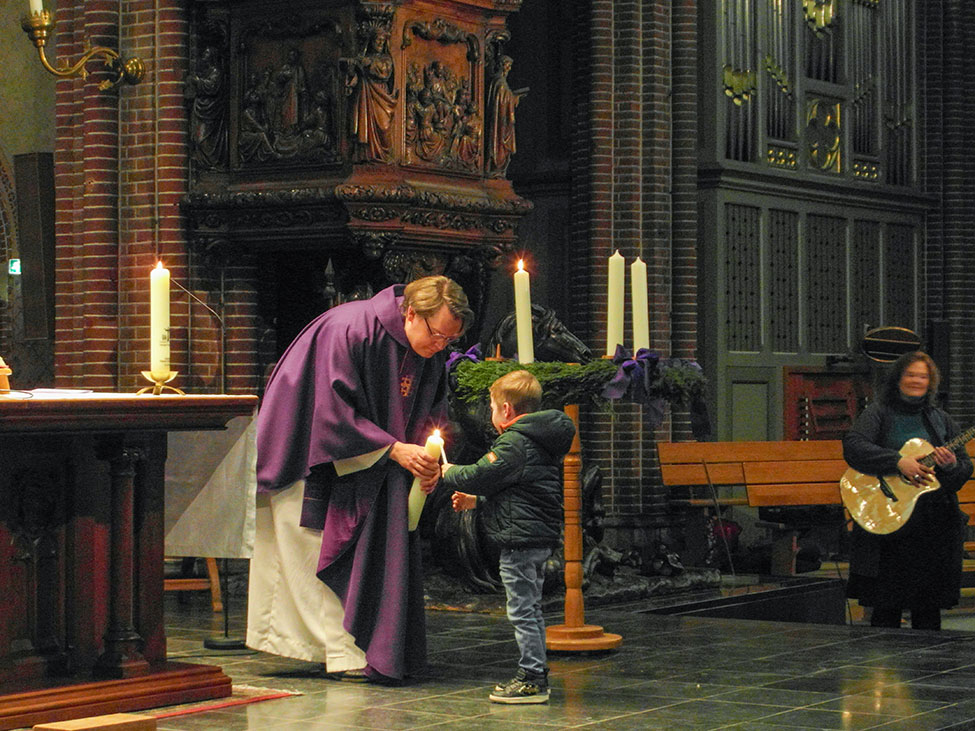 De pastoor sprak met de ouders over ‘geloven’. Geloven kan een uitdaging zijn. ‘Durf je in die kruiwagen te stappen?’, vroeg de pastoor, ‘Durf je God echt te vertrouwen?’. Vervolgens legde hij uit dat de Bijbel eigenlijk een bundel kleinere boeken is, die vanuit een eigen invalshoek zijn geschreven onder inspiratie van de Heilige Geest. In zijn preek verbond hij onze Sinterklaas-voorpret van afgelopen week met de verwachting van Kerstmis, ofwel de Advent. Op een groot feest bereid je je voor. Wij doen we dat door ons wat meer naar God te keren en misschien iets anders te gaan leven. ‘Laten we zijn zoals een zonnebloem die zich naar de zon keert’, besloot hij.