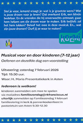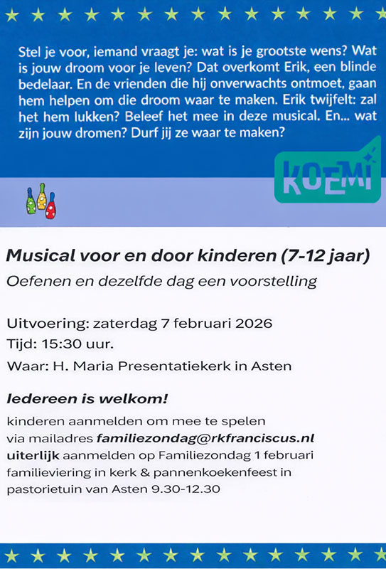 De musical maakt deel uit van het traject van Familiezondagen en het Communieproject. Maar ook andere geïnteresseerde kinderen mogen natuurlijk meedoen. Deze kinderen kunnen worden aangemeld via de onderstaande contactgegevens.