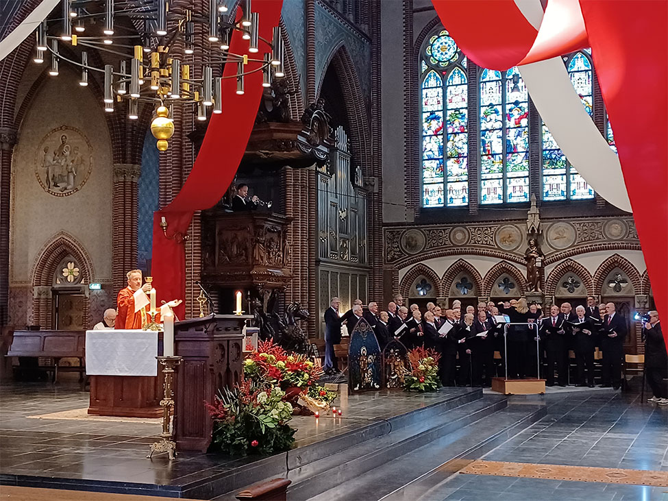 Pastor Schevers ging voor tijdens de viering van Tweede Kerstdag in Asten. De viering werd opgeluisterd door het Astens Mannenkoor en dit jaar speelde er ook een trompettist mee vanaf een hoge positie.