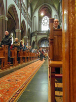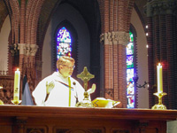 De deken zinspeelde op de vele recente wisselingen in het pastorale team in onze parochie. Toch is het belangrijkste, aldus de deken, dat een pastoor een dienstknecht is van Christus en de Kerk. ‘Het is het werk van de Heilige Geest, geen mensenwerk. Het wordt gedragen door geloof en gebed. Maar zou Jezus bij ons geloof vinden? God zoekt God-zoekers en bidders. De prioriteit van jullie pastoor is dus: Jezus verkondigen. De Kerk is kwetsbaar geworden, maar er is hoop vanwege Jezus! Laat ieders talent daarom ten dienste van de geloofsgemeenschap staan’.