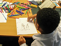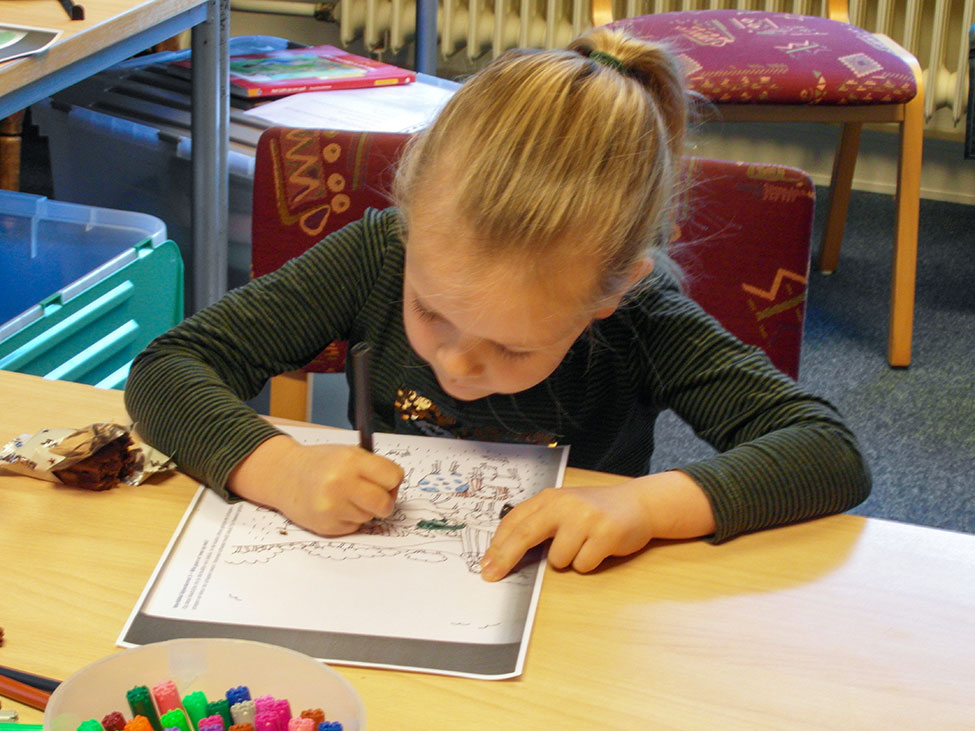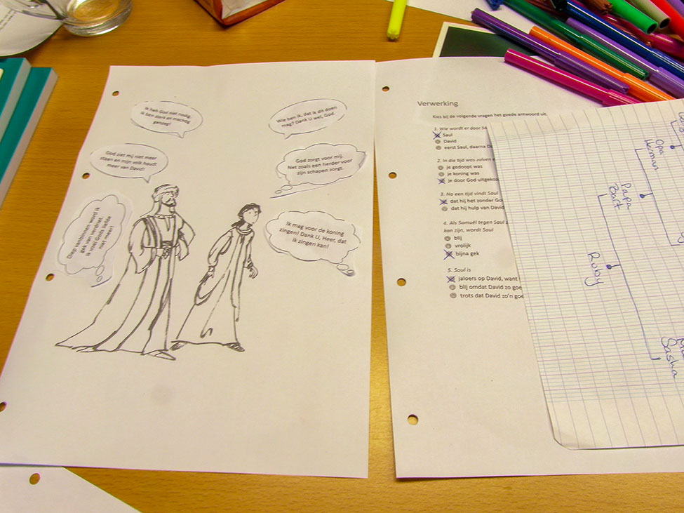 De oudere kinderen begonnen deze keer met het huiswerk van de vorige keer. Ze hadden uitgezocht hoe hun vader, moeder, opa’s, oma’s en hun vaders en moeder (enzovoort) heetten en al die namen in een echte stamboom geschreven. Wij komen niet zomaar uit de lucht vallen. Ook Jezus kwam niet zomaar uit de lucht vallen. Er werd verteld over David, de bet-bet-bet . . . – overgrootvader van Jezus. David vertrouwde op God en besefte dat hij niet zonder God kon. Koning Saul was dat vergeten. Daarom was Saul jaloers en boos, maar ook heel verdrietig, want hij voelde Gods liefde niet meer…