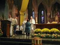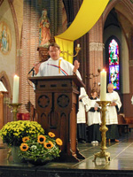 Die viering had een plechtig karakter. Bij aanvang werd de benoemingsbrief van de bisschop voorgelezen. De aanhef daarvan klonk alsof hij door Petrus of Paulus in eigen persoon geschreven was. De katholieke Kerk gaat niet voor niets terug op de oude apostolische tradities. En er waren nog meer speciale riten. Pastoor Hedebouw hernieuwde zijn wijdingsbeloften aan deken Seidel, die namens de bisschop optrad, en beloofde zijn taak als pastoor van onze parochie ‘naar eer en geweten te vervullen, tot lof van Gods Naam en tot heil van de Kerk en de gelovigen’. Daarna overhandigden parochianen uit alle parochielocaties - via de deken - enkele symbolen aan pastoor Hedebouw: de sleutels van de kerken, het Evangelieboek, een parochiekaars, de kelk en ciborie en een beeltenis van Onze Lieve Vrouwe van Ommel.