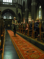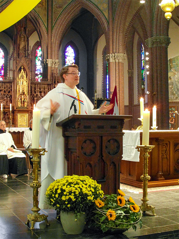 De deken zinspeelde op de vele recente wisselingen in het pastorale team in onze parochie. Toch is het belangrijkste, aldus de deken, dat een pastoor een dienstknecht is van Christus en de Kerk. ‘Het is het werk van de Heilige Geest, geen mensenwerk. Het wordt gedragen door geloof en gebed. Maar zou Jezus bij ons geloof vinden? God zoekt God-zoekers en bidders. De prioriteit van jullie pastoor is dus: Jezus verkondigen. De Kerk is kwetsbaar geworden, maar er is hoop vanwege Jezus! Laat ieders talent daarom ten dienste van de geloofsgemeenschap staan’.