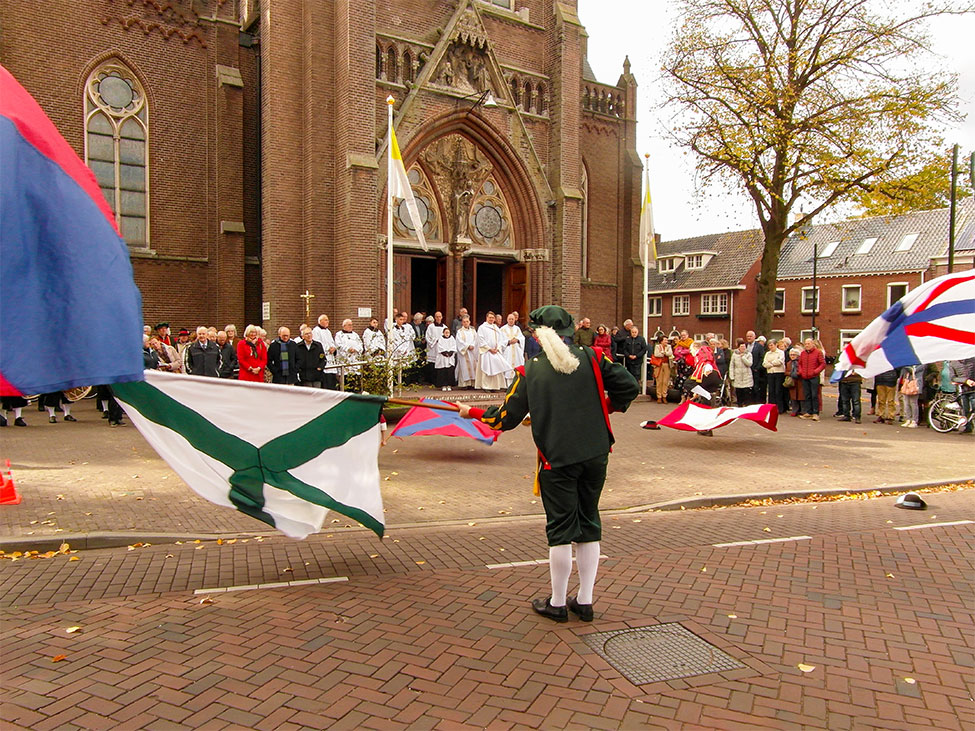 Vrijdag kon je al zien dat er iets bijzonders ging gebeuren. Er waren extra stoelen klaargezet, de linten hingen boven het altaar en de bloemen straalden feestelijk. Want zondag 19 oktober was de installatieviering van pastoor Hedebouw. Een kleurrijke viering, met een flinke delegatie van de vele gilden uit onze parochie erbij.